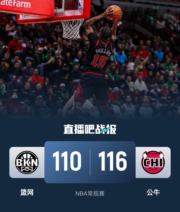 公牛(28-38):怀特31分7板4助、许尔特18分9板3助、特雷-琼斯18分7板6助3断、菲利普斯16分7板5助、帕威10分2板1助、科林斯9分8板1助3帽、武切维奇7分3板3助、布泽利斯6分3板1助、特里1分1板