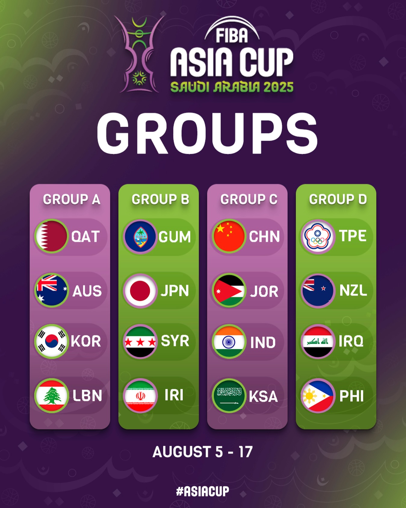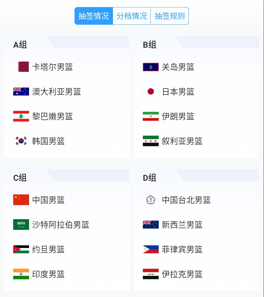 04月08日讯 今日,2025国际篮联第31届亚洲杯抽签仪式在沙特吉达举行。最终签位如下: