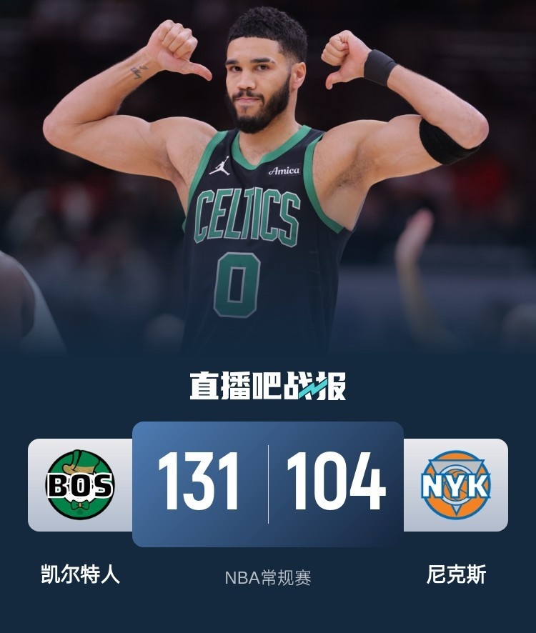 首节之争开局完全不像两支纸面阵容势均力敌的对决,尼克斯进攻端受限9分钟里仅得9分,绿军则多点开花轰出26-9的攻势直接拉开两位数的分差;尼克斯虽然在这之后逐渐找到进攻感觉但已经无力阻止起势的对手,绿军在第二节毫无压力延续多点开花的攻势,第二节他们再砍31分并带着13分优势进入下半场。休息归来尼克斯反扑也一度追至个位数,但绿军总有球员站出来,末段连着三记三分外加造三分犯规连拿12分杀人诛心,塔图姆续上火力爆砍13分,绿军暴走将分差拉大至20分打垮尼克斯防线,末节分差越拉越大早早失去悬念。最终,凯尔特人大胜尼克斯坐稳东部第二的位置。