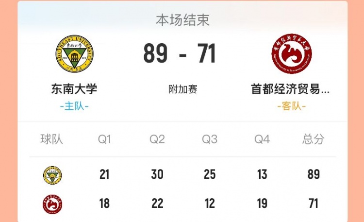 末节决战,双方展开拉锯战,双方命中率都有降低,首都经贸逐渐换上替补练兵,薛海海里突外投连砍10分助队迅速缩小分差。陈子昂站出来止血,祝子轩补篮稳住20分以上领先,时间越来越少,最终东南大学89-71轻取首都经贸。