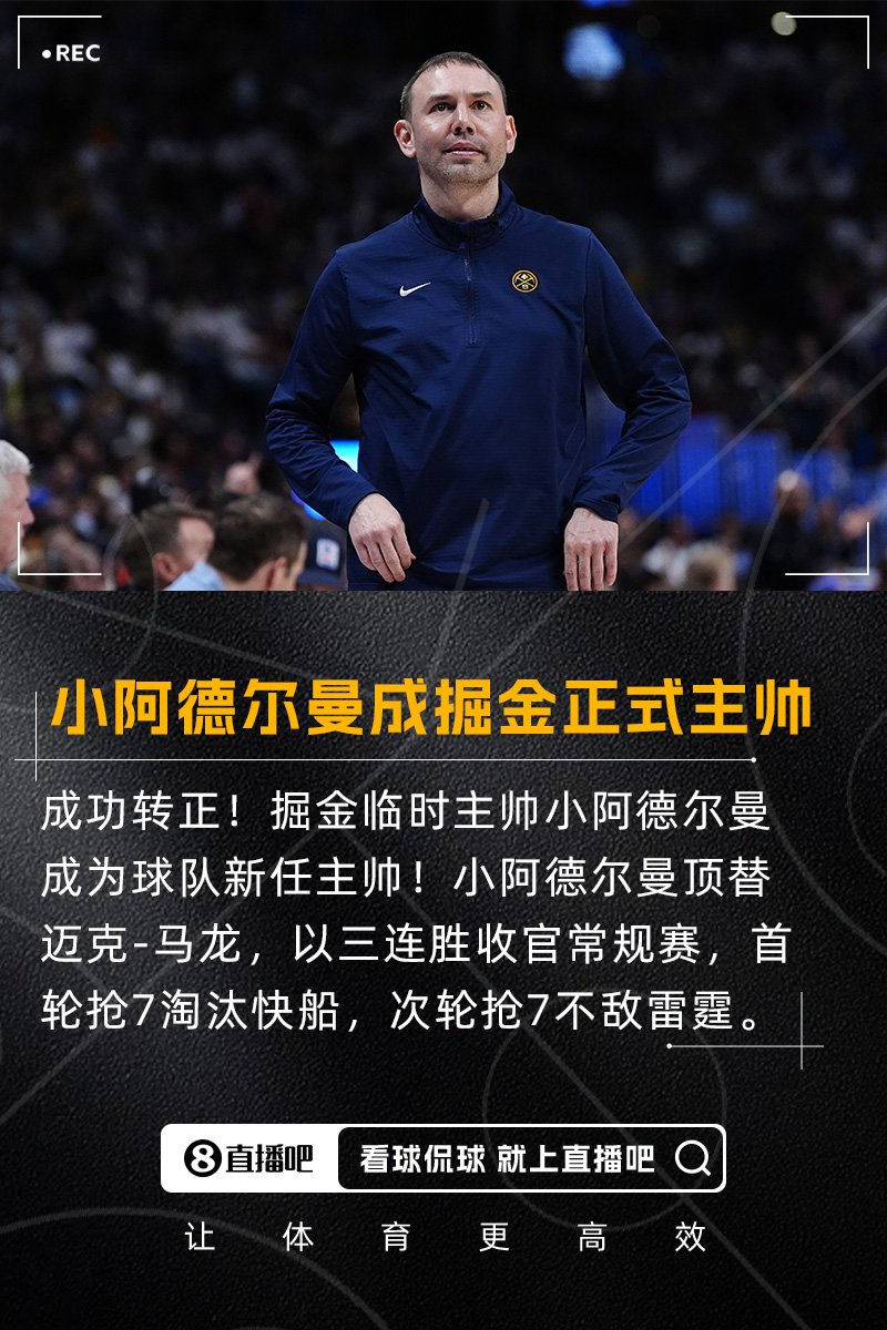 顶替冠军教头小阿德尔曼成为掘金正式主帅 此前带队进第二轮