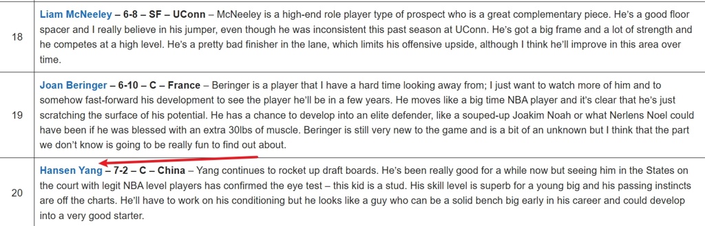 美媒给第20位的杨瀚森给出的评价:杨的选秀顺位持续飙升。他一直以来都很棒,但和美国真正的NBA级别的球员同台竞技之后则证实了这一点,这个小孩确实是个良才。对一名年轻的大个子而言,他的技术水平非常出色,传球直觉也相当厉害。他必须努力抬升自己的身体素质,但他看起来可以在职业生涯早期成为一名可靠的替补内线,并且有可能发展成为一名优秀的首发级别球员。