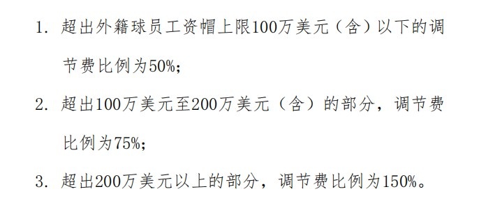 当然,CBA的外援工资帽是软帽,可以超过,超过的部分按规定交调节费即可,类似NBA的奢侈税。新赛季的缴纳规则如下: