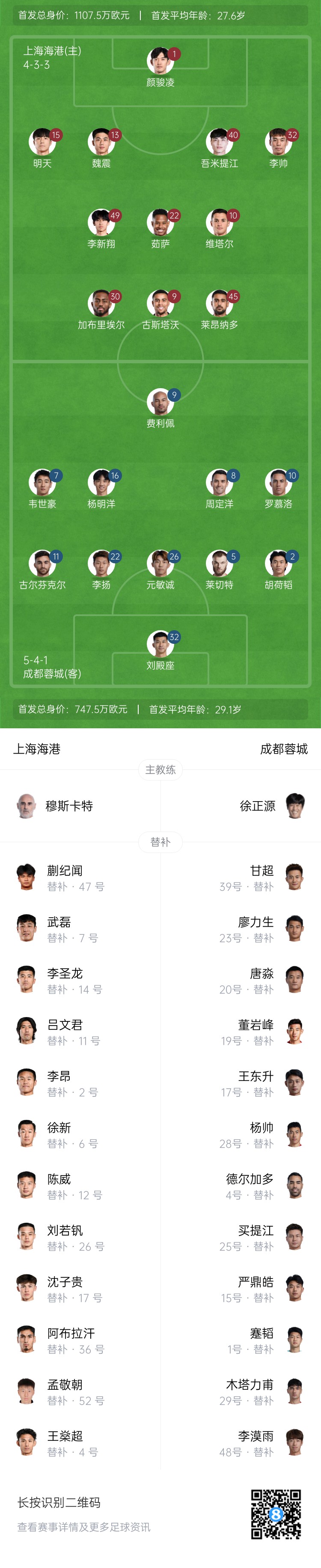 上海海港首发:1-颜骏凌、13-魏震、15-明天、32-李帅、40-吾米提江-玉苏普、10-马特乌斯-维塔尔(F)、22-马修斯-茹萨(F)、9-古斯塔沃(F)、30-加布里埃尔(F)、45-莱昂纳多(F)、49-李新翔