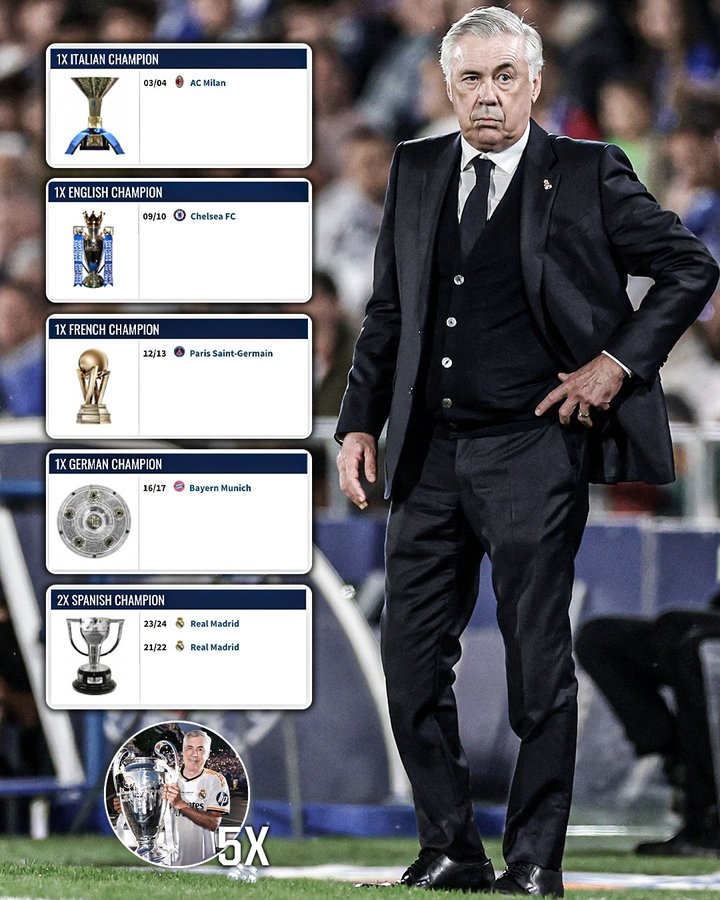 安切洛蒂是首位也是唯一一位在欧洲五大联赛全部赢得过冠军的主教练。他还在欧冠历史上以主教练身份夺冠次数最多,共计获得过5次欧冠冠军,超越所有同行。已经功成名就的安帅,下一站会去哪里?