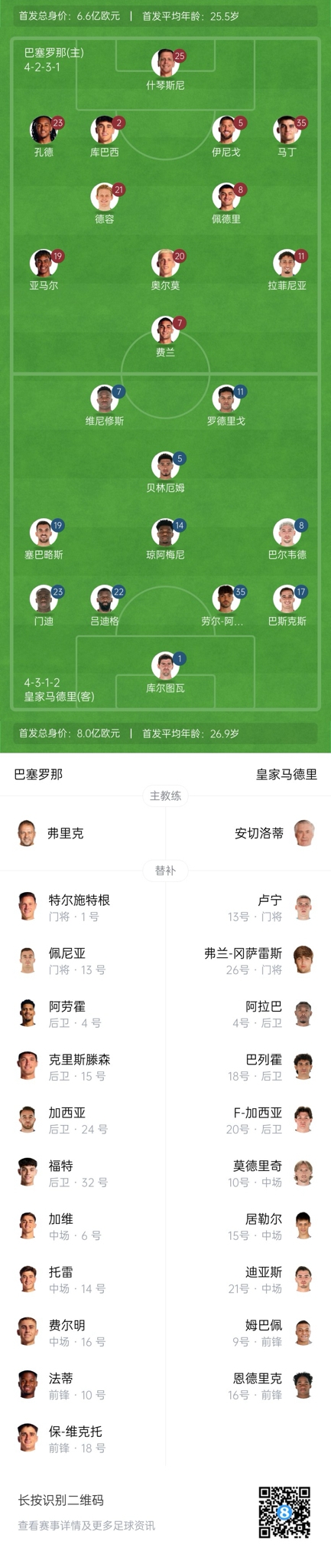 巴萨首发:25-什琴斯尼、2-库巴西、5-伊尼戈-马丁内斯、23-孔德、35-杰拉德-马丁、8-佩德里、20-奥尔莫、21-德容、7-费兰-托雷斯、19-亚马尔、11-拉菲尼亚