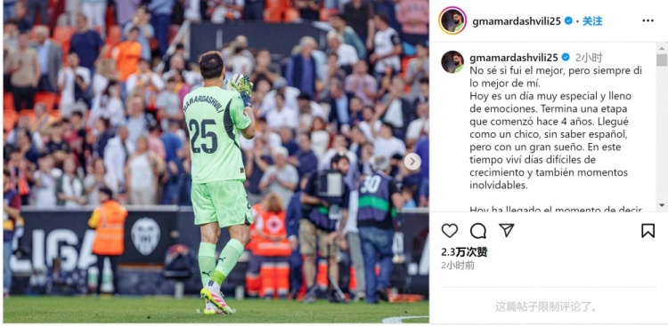 玛玛达什维利告别瓦伦西亚:相信我留下了故事,感谢支持我的人