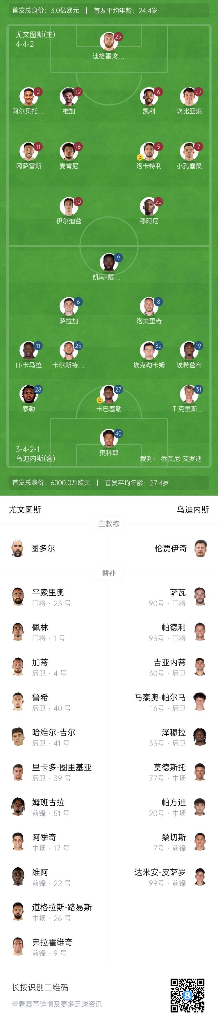 尤文vs乌迪内斯首发:伊尔迪兹领衔 穆阿尼、孔塞桑、凯利出战