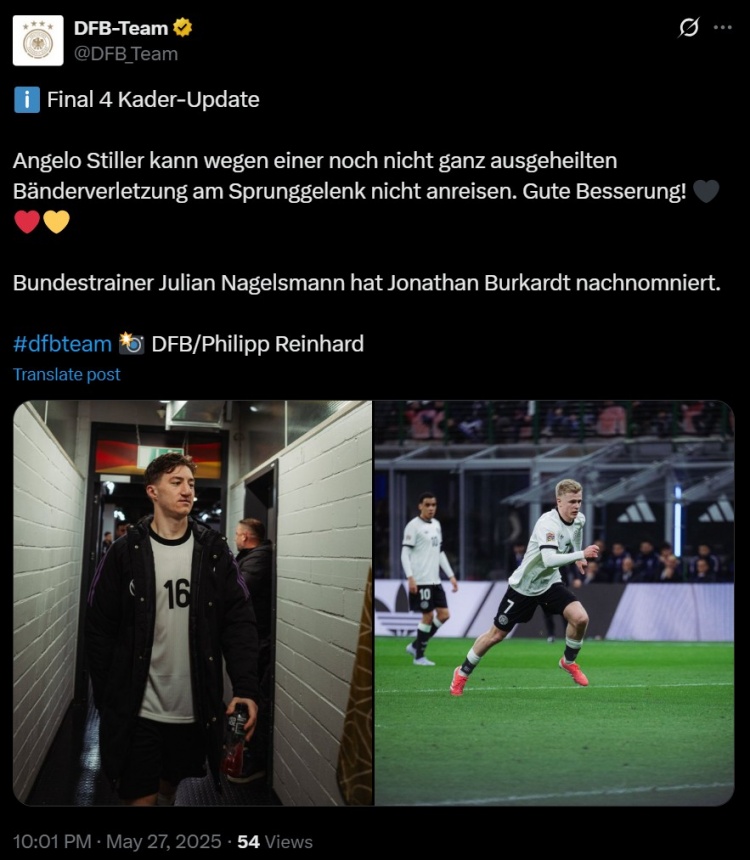 5月27日讯 德国足协官方消息,斯蒂勒因伤退出本期德国国家队,纳格尔斯曼选择补招美因茨前锋布尔卡特。