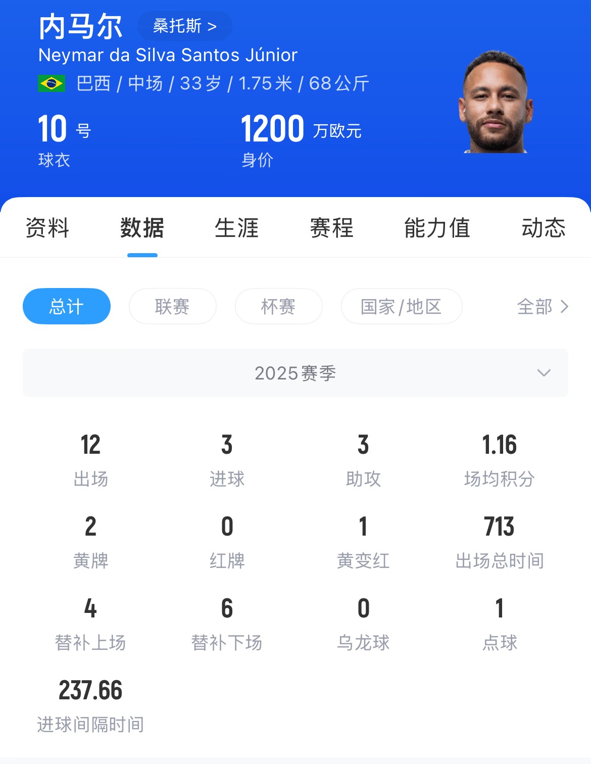 本赛季内马尔各项赛事出场12次,贡献3球3助攻(均来自圣保罗州锦标赛)。最近一次是本月1日对阵博塔弗戈时因手球破门被红牌罚下。