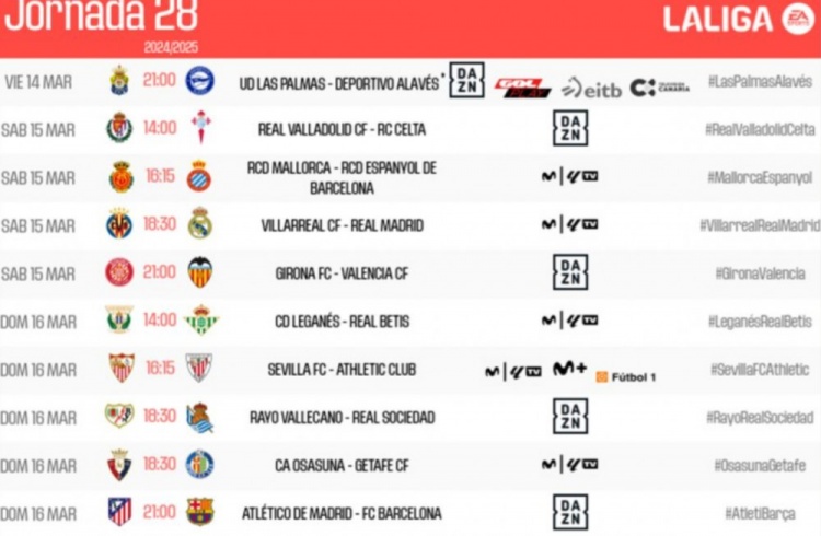 西甲公布联赛第28轮比赛时间:马竞vs巴萨强强对话,皇马客战黄潜