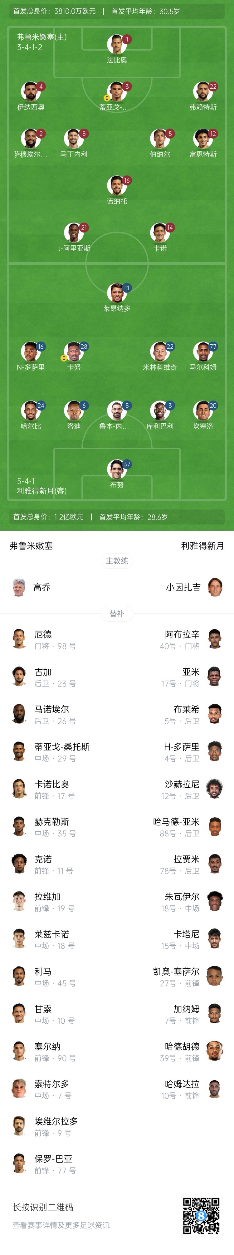 弗鲁米嫩塞vs利雅得新月首发:米林、弟媳先发,哈姆达拉替补